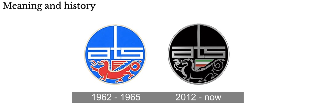 一條鮮紅熾焰的巨龍引人注目,象徵着品牌的強大力量、迅捷速度和澎湃能量。它位於一個亮藍色圓圈的底部,圓圈邊緣飾以白色邊框。白色的“ATS”公司首字母印在徽標中央。字體經過精心挑選,使這幾個字母構成近乎完美的對稱圖案。