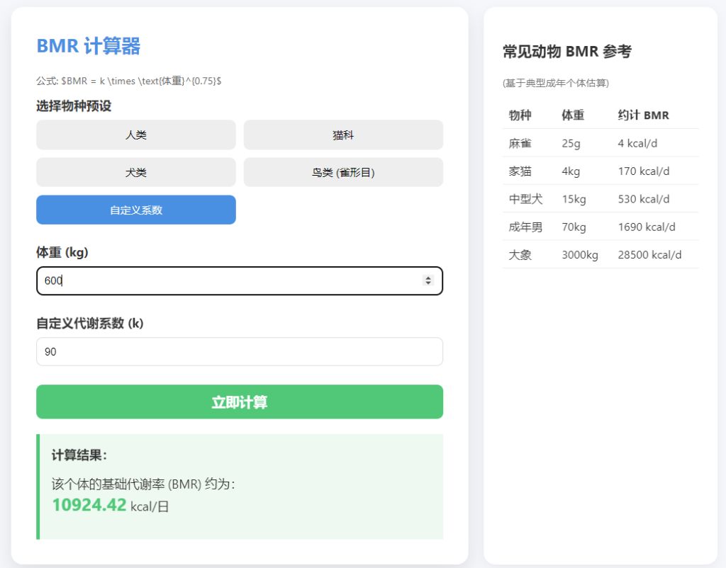 output.innerHTML = `该个体的基础代谢率 (BMR) 约为:<br><b style="font-size: 1.4rem; color: #50c878;">${bmr.toFixed(2)}</b> kcal/日`;