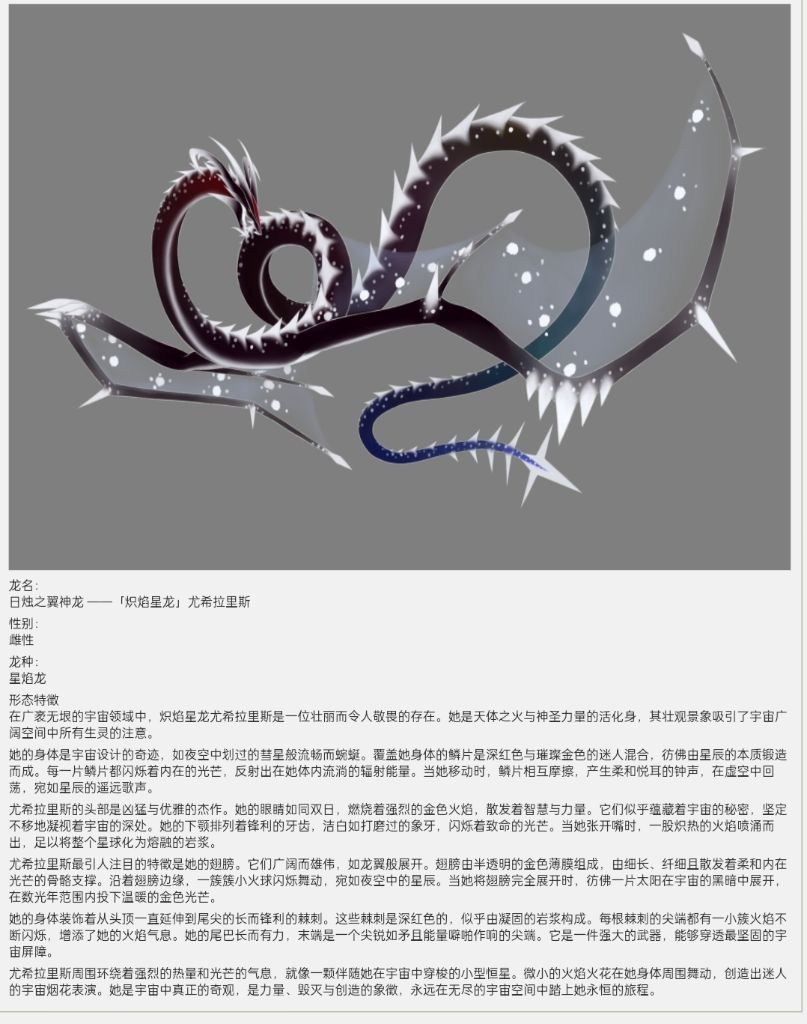 琥珀色的眼睛在近似龍族的面孔上眨動,白得像冰封星球的鱗片覆蓋全身,灰色的陰影在棱角處沉積。沒有喙,也沒有裸露的雙翼,但他們的形態暗示着他們確實源自母親很久以前救下的那些獸類。