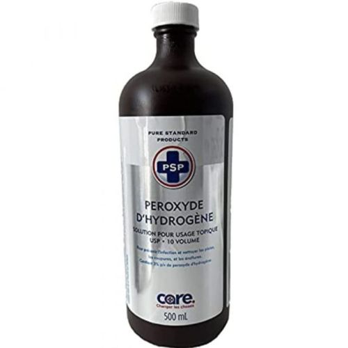 我手上這瓶醫用雙氧水是 3% 濃度,用來消毒皮膚和傷口,直接倒在手上的話很快能看到手掌的角質皮膚變白。