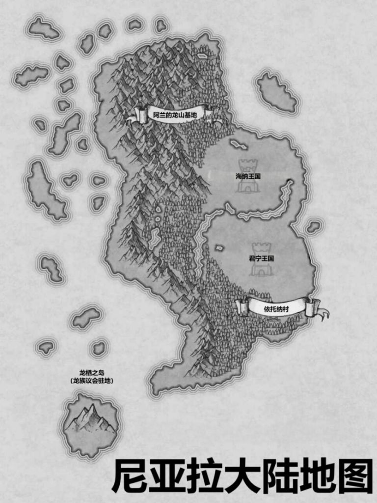 然後是小說的大致世界觀介紹,小說發生在名爲尼亞拉的大陸上(典中典天圓地方世界只有一片陸地),大陸南北的兩個國家:海納王國和君寧王國爆發了曠日已久的戰爭,龍們則是在龍族議會的帶領下,棲息在南方的島嶼上(但顯然也有巨龍在整個大陸廣泛分佈)。君寧那裏的依託納村是後面幾部纔會出現的場景,我現在在糾結要不要把它翻譯爲更貼合劇情內容的”翼拓納“或者”翼屠納“,因爲那是一個以屠龍而聞名的地方